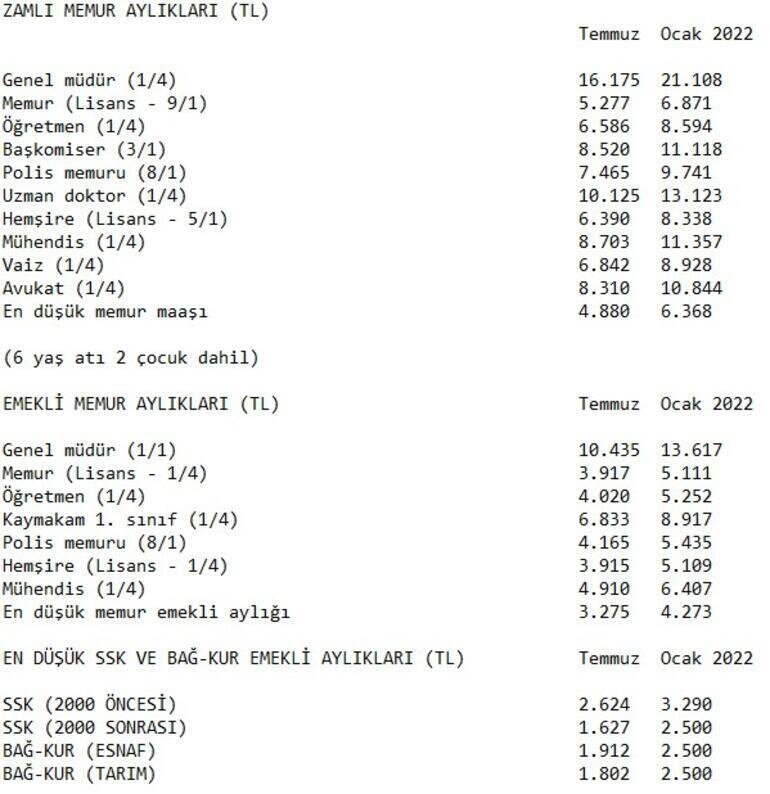 Açıklanan enflasyon oranları ve Cumhurbaşkanı Erdoğan'ın açıkladığı ek zamlara göre, ocak ayı için memur ve emekli aylıklarındaki artış şöyle oldu:
