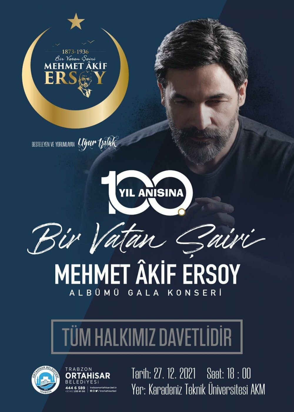Ortahisar Belediyesi, İstiklâl Marşı’nın yazarı Milli Şair Mehmet Âkif Ersoy’un 100. yıl anısına bir konser etkinliği düzenleyecek. Karadeniz Teknik Üniversitesi Atatürk Kültür Merkezi’nde 27/12/2021 tarihinde saat 18.00’da başlayacak konserde ses sanatçısı Uğur Işılak, Mehmet Akif Ersoy’un şiirlerinden besteleyip yorumladığı şarkıları icra edecek.