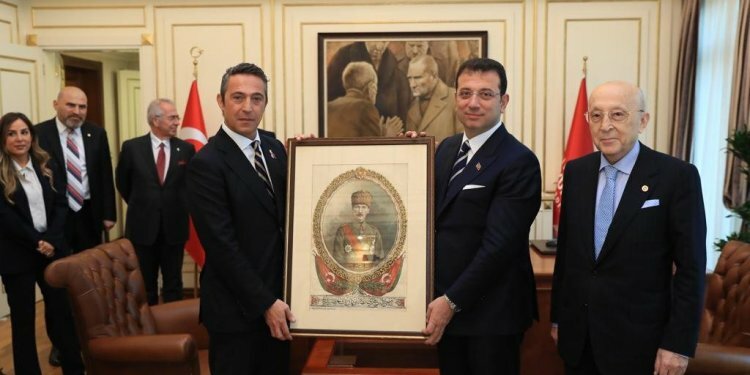 Fenerbahçe Kulübü Başkanı Ali Koç, İstanbul Büyükşehir Belediye Başkanı Ekrem İmamoğlu’nu makamında ziyaret etti. Sarı-lacivertli kulüpten yapılan açıklamaya göre ziyarette, Fenerbahçe Kulübü Yüksek Divan Kurulu Başkanı Vefa Küçük ve kulüp yönetim kurulu üyeleri de bulundu. Koç, İmamoğlu’na, kendisinin ve Vefa Küçük’ün imzaladığı Fenerbahçe formasının yanında, Atatürk portresi ve “Fotoğraflarla Atatürk” adlı kitabı hediye etti.