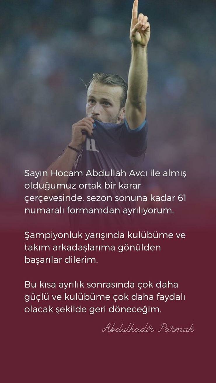"Sayın Hocam Abdullah Avcı ile almış olduğumuz ortak bir karar çerçevesinde, sezon sonuna kadar 61 numaralı formadan ayrılıyorum. Şampiyonluk yarışında kulübüme ve takım arkadaşlarıma gönülden başarılar dilerim. Bu kısa ayrılık sonrasında çok daha güçlü ve kulübüme çok daha faydalı olacak şekilde geri döneceğim"