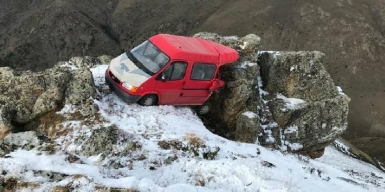 Uçurumdan yuvarlanan minibüs, yamaçta bulunan iki kaya parçasının arasında takılı kaldı. Kayalara tutunan minibüs, daha da büyük uçuruma düşmekten kıl payı kurtuldu.